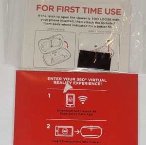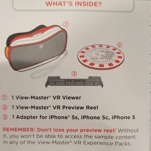 View Master Virtual Reality Starter Pack. Comes With One Virtual Reality Preview Reel. Instruction Inside Box. View Master Use A phone In The Picture Show With Phone Is Compatible With The Device. Smoke Free Home