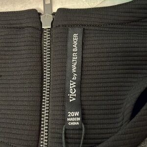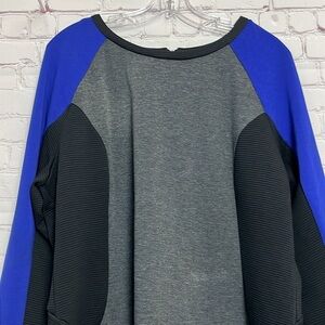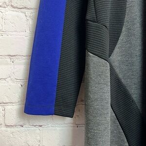 View by Walter Baker long sleeve dress in fun blue, black and grey color blocking design. Knit fabrication. Thoughtfully placed color block panels. Crew neckline. Zips up back. Approximately knee length.