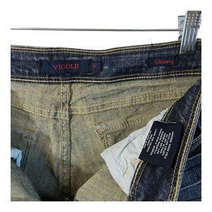 The Vigold Skinny Jeans in women's size 7 offer a low rise fit with a faded, whiskered slub denim design, perfect for a Y2K and 90s inspired look. Made from a blend of cotton and spandex, these jeans feature a zip fly closure, button waist, and a 5-pocket design with back pocket embroidery accents. The slim fit and solid pattern make them a versatile choice for all seasons, while the medium wash adds a trendy touch to the classic blue color. Machine washable for easy care, these jeans combine style and comfort for a flattering wardrobe staple.