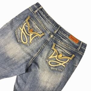 In excellent used condition, there are two small purple dots on the back bottom (see pictures for details). With a light to medium wash and a tapered skinny fit, these jeans are a versatile addition to your wardrobe.