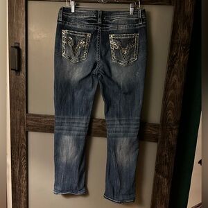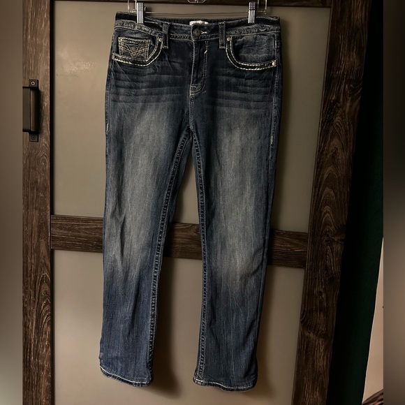 Dark wash, straight leg Vigoss jeans with rhinestone pockets #jeans #western