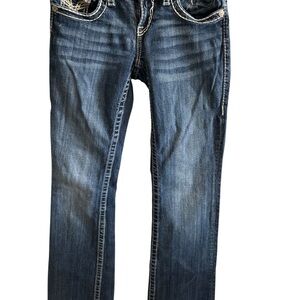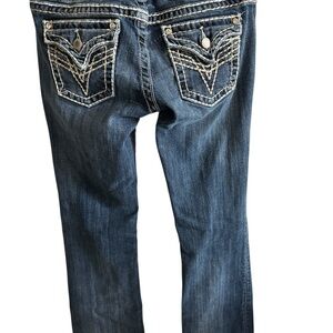 Dark wash faded denim by Vigoss. Features contrast thick double stitching and stylish pocket design, bejeweled pockets, bootcut, stretch. Low rise.