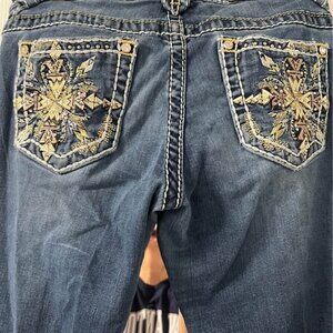 The Vigoss Women's Chelsea Bootcut Jeans in size 3/4 are a stylish and versatile addition to any wardrobe. Made with a blend of spandex and cotton, these dark wash denim jeans feature a slim fit and a low rise. The jeans are accented with rhinestones and embroidery, giving them a touch of flair. With a 33-inch inseam and a 5-pocket design, these jeans are both fashionable and practical, perfect for year-round wear. The zip and button closure ensures a secure fit, while the machine washable fabric makes them easy to care for.