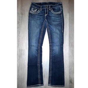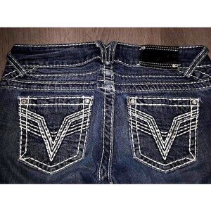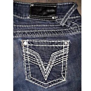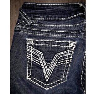 Women's Vigoss The Chelsea Slim Boot Cut Jeans. Size 3/4 Length 33. Studded and embroidered front and back pockets accented with rhinestone bling. Dark wash denim. ***PLEASE NOTE*** There's some small spot stains. Please see all of the photos. Intentionally distressed denim.