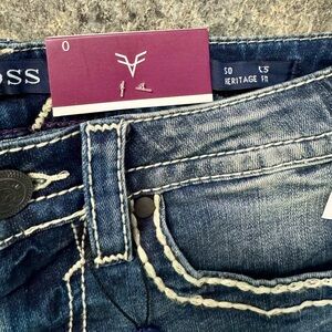 Chic Vigoss denim shorts. Dark blue with contrast white stitching. Ideal for casual outings.