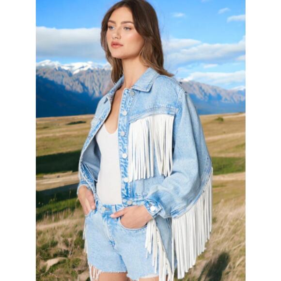 Vigoss Denim Jean Jacket Light Wash with White Fringe Vintage Style Button-down