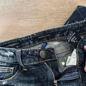 Women’s size 24/00 Vigoss Studio Dublin Skinny jeans with distressed design. Not much stretch if any. Low rise, sexy and flattering fit. Other than extensive distressing as shown, very good preowned condition, clean nonsmoking home. Approx 13.5” across waist laid flat, 31.5” inseam, 7” rise.