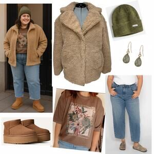 Need a cozy forest cabincore outfit? Pair this teddy coat with your favorite graphic t-shirt, wide leg boyfriend jeans, short slipper boots, simple jewelry and a knit hat.