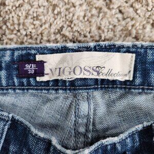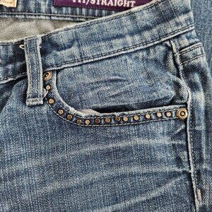 These jeans are by Vigoss. They are a fit/straight leg fit in a light wash blue denim. They have front and back pockets with stud detailing. They have a single button and zipper fly closure. They are in excellent pre-owned condition with no holes or stains. There is wear to the cuffs and waist band and around pockets, giving it a distressed look. Bundle with other items in my closet to get the most out of shipping!
