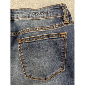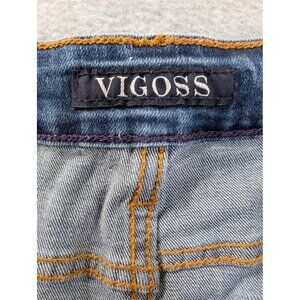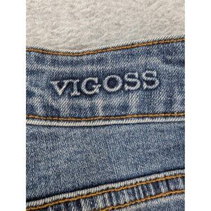 Details: Five-pocket design, zip fly with button closure, contrast stitching, Vigoss logo hardware and back waistband embroidery, raw-cut hems with intentional distressed slits at front, stretch denim for comfort.