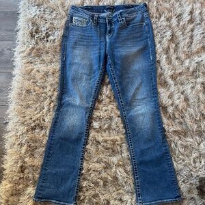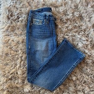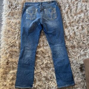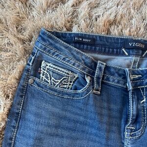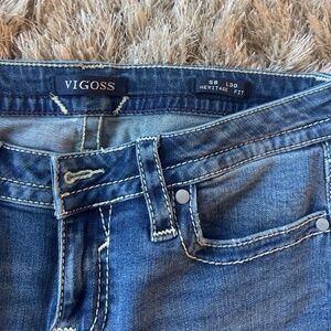 Vigoss Heritage Fit Jeans, EUC, Size 8, Slim bootcut with light wash and white stitching. Measures 31" waist and 30" length.