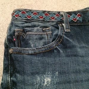 Never worn high waist lightly destroyed denim shorts from Vigoss. Has blue, red and white tribal pattern around the waist.