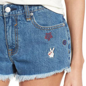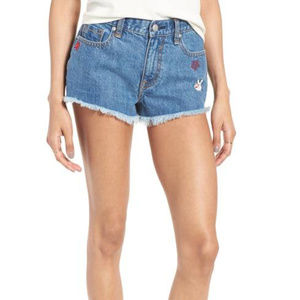 Colorful embroidery brings playful throwback appeal to relaxed denim shorts finished with frayed cutoff hems.