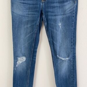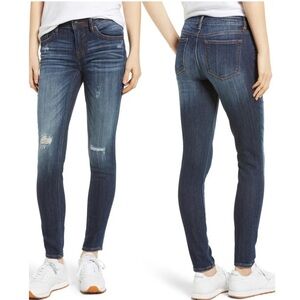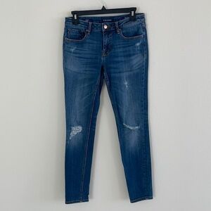 In good preowned condition mid rise dark wash skinny jeans zip fly with bottom closure Five-pocket style ripped style
