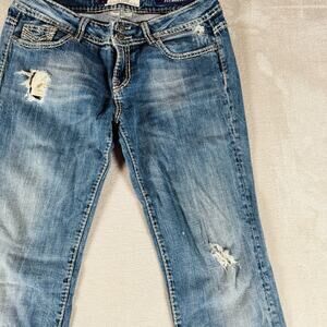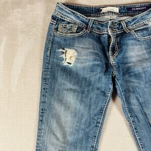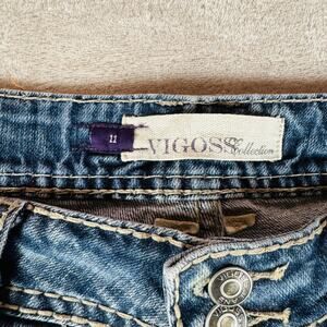 For sale is a: Vigoss Jeans Women's 11 Blue Fit Bootcut Mid Rise Distressed Medium Wash Stretch