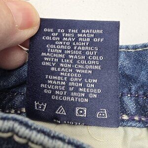 Care info (from tag): Due to the nature of this wash, color may rub off onto light colored fabrics; turn inside out; machine wash cold with like colors; non-chlorine bleach when needed; tumble dry low; warm iron on reverse if needed; do not iron on decoration