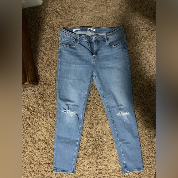 Trendy light blue skinny jeans with distressed details. Perfect for casual wear. Offers a sleek and modern fit.