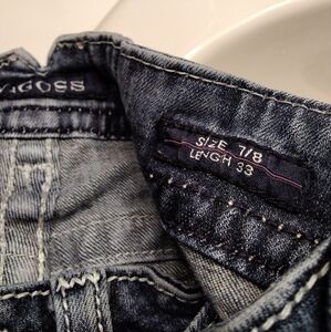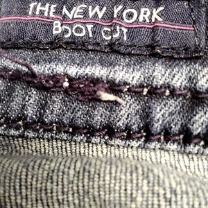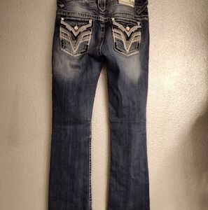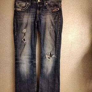 Medium wash Mid rise Distressed Jeweled buttons throughout Heavy stitching on back pockets