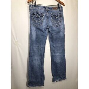 Elevate your denim game with these Vigoss Slim Boot Jeans in size 29. The mid-rise jeans come in a beautiful blue denim color with a solid pattern and a 5-pocket design. The zip closure and button accent add a touch of style to the jeans, which are perfect for any season winter, summer, fall, or spring.