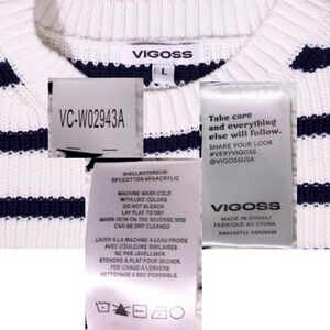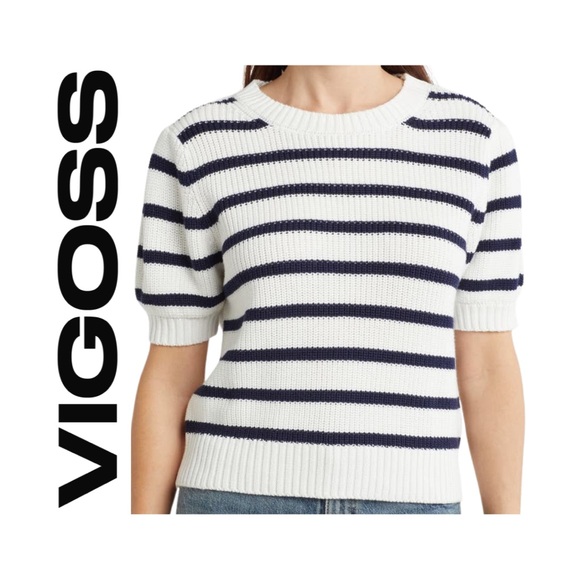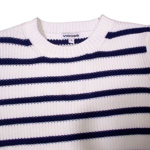 Cozy and classic! This Vigoss short-sleeve striped sweater features a soft rib-knit texture, navy horizontal stripes, and a relaxed silhouette that pairs perfectly with jeans, shorts, or layered under jackets. Great weight for spring, summer evenings, or fall layering.