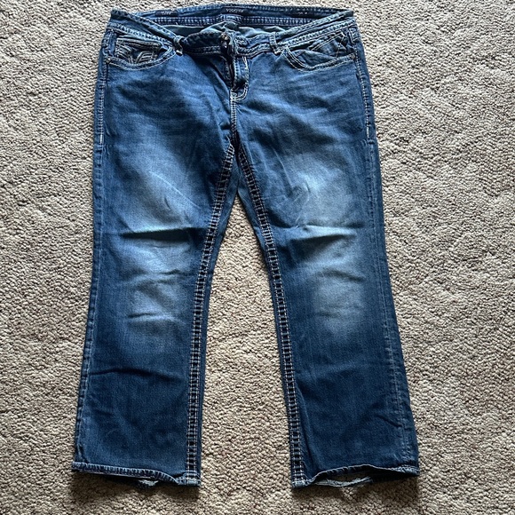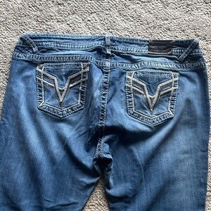 Chic boot cut jeans by Vigoss. Dark blue wash. Classic style for versatile wear. Vigoss The Chelsea Slim Boot plus size 24 length 31. They are frayed at the bottom! Perfect for cut off style but still intact enough that they could be sewn back together. Very very comfy jeans! My weight loss, your gain!