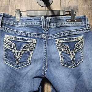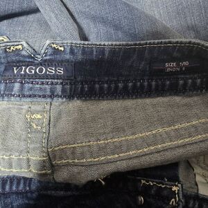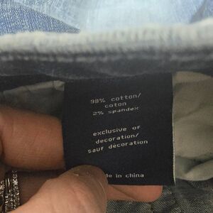 Details: 2 button and zipper fly, stretchy, embroidered pockets, medium wash, Bermuda length