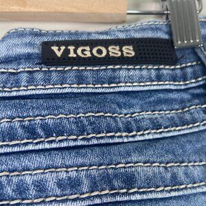 The Vigoss The Dublin Denim Capris in size 7/8 waist with low rise and rhinestone buttons are a stylish pair of Y2k-era jeans. Made from a blend of denim, spandex, and cotton, these capris feature a 5-pocket design and a solid blue exterior color. The distressed detailing and low rise give them a trendy and edgy look, perfect for summer, fall, and spring wear. The brand VIGOSS adds a touch of rock-inspired flair, making these capris a must-have for any fashion-forward woman's wardrobe. Inseam 23”