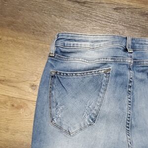 thompson tomboy cut. These Vigoss blue skinny jeans showcase a chic distressed design with a natural fading effect. The skinny fit and tapered leg offer a modern, stylish silhouette perfect for casual outings.
