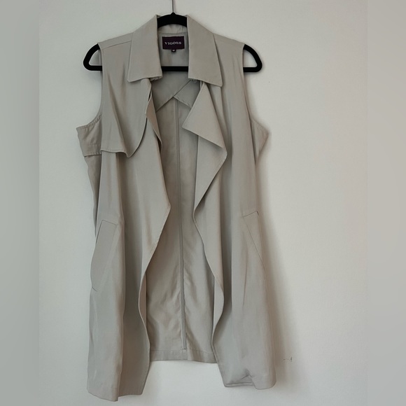 Sleeveless vest style trench coat. Beige/grey color
