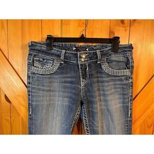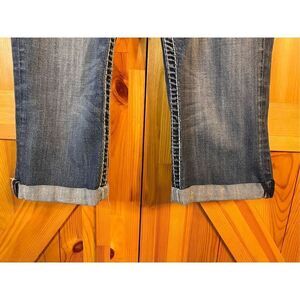 Vigoss Womens Jeans Size 11/31 Distressed Stretch Denim labeled Bootcut have been altered to cropped, cuffed,thick stitched, stretchy, distressed measurements 31x19” 8” rise (2447)