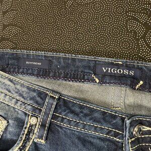 These Vigoss jeans offer a comfortable boyfriend fit, crafted from quality denim. The intricate stitching and faded wash create a stylish, relaxed look suitable for various casual settings.