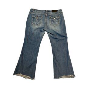 Vigoss Womens Size 8 Fit Bootcut jeans Raw Hem Blue Denim Flap Back Pockets Tan