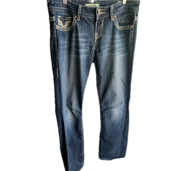 Vigoss bootcut distressesd size 11 length 34 Rise 9” Wear on back hem as shown in pictures #348 pd