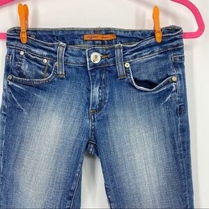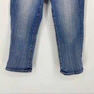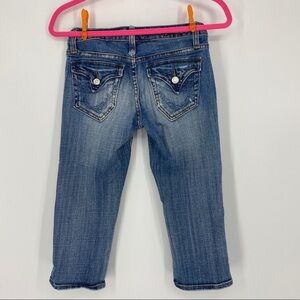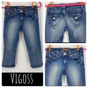 Vigoss medium wash Capri jeans with flap pockets. Button and zipper closure. Back flap pockets. 99% cotton, 1% spandex. Size 1.