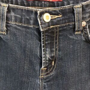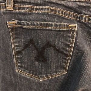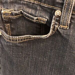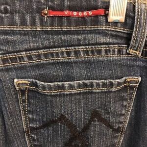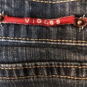 Vigoss women’s blue jeans. Bootcut. Waist 15”. Front rise 8”. Back rise 13”. Zipper and button closure See picture of flaw on leg. Unsure what it is. Inseam 31”. 11