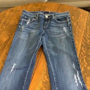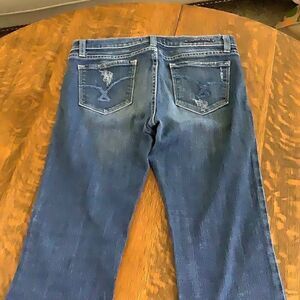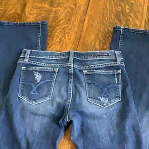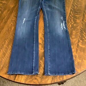 Cute distressed jeans with flare legs and fading. In excellent condition. Width at waist 15.5”. Hip 17”. Rise 8.5”. Inseam 30.5”.
