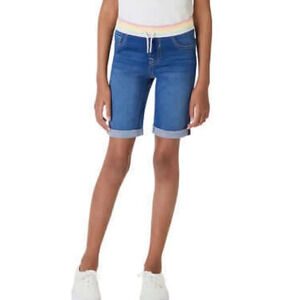 Denim pull on short with colorful waistband and non fucntional drawstrings