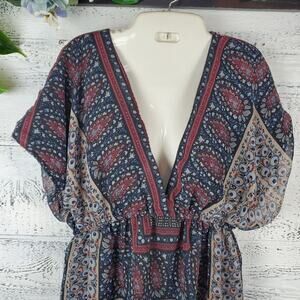 Beautiful and lightweight mini dress from She’s Cool. This 1X top features a deep V-neckline, empire waist, and flowy kimono sleeves in a mixed paisley floral print. Perfect for casual boho-chic styling or summer festivals.