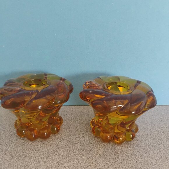 Viking Art Glass MCM Twist Design Set of 2 Candleholders Amber