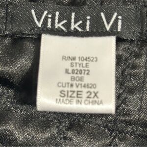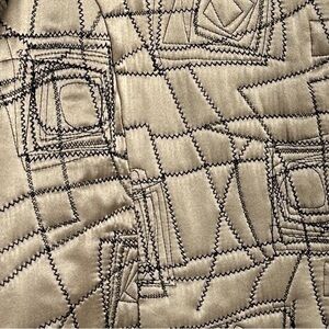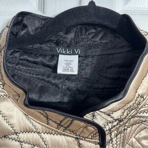 Gorgeous Vikki Vi size 2X jacket. Tan with abstract black stitching, magnetic front closure. Side slash pockets. 100% silk shell with polyester lining. Luminous!