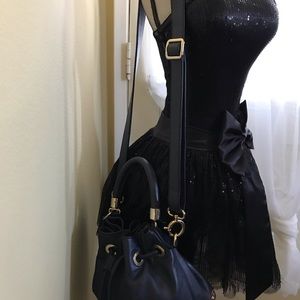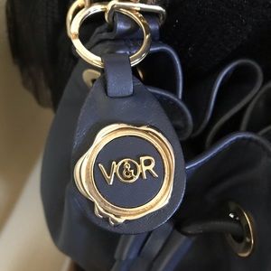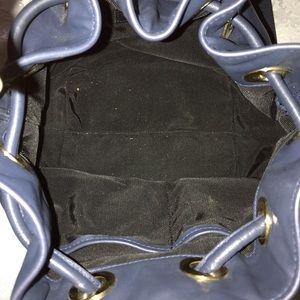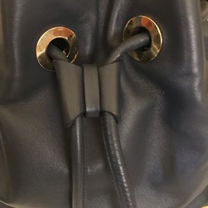 Beautiful Navy Blue Viktor & Rolf Drawstring Bucket Bag. You can use as shoulder, crossbody or handbag. The leather is flawless and buttery soft. First two photos are stock photos with original price. Four metal feet, removable and adjustable shoulder strap. Interior has two open pockets and one zip compartment. Gently & rarely carried. Reasonable offers considered.