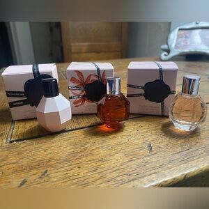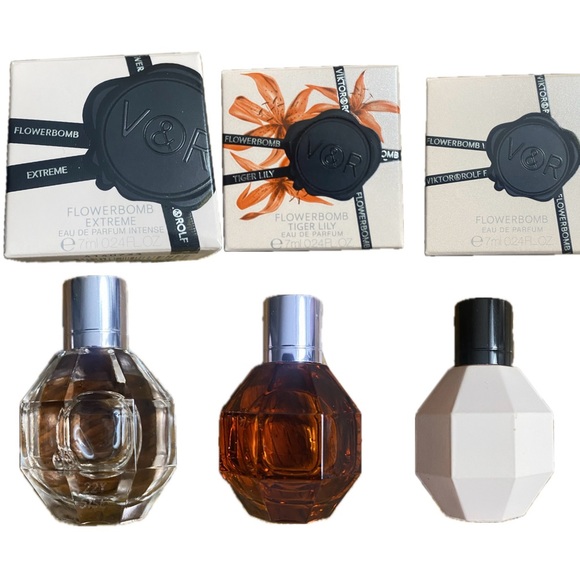 Parfum Elegant trio of Viktor & Rolf Flowerbomb deluxe minis. Includes: intense, tiger lily, and classic variants. Perfect for any occasion. Keep one for yourself and give one or two as gifts. Great stocking stuffers. New, only times the boxes were opened was to photograph.