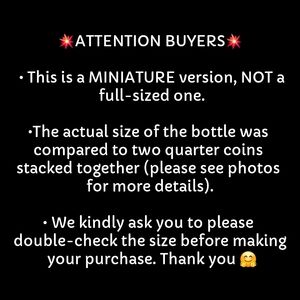 •The actual size of the bottle was compared to two quarter coins stacked together (please see photos for more details).