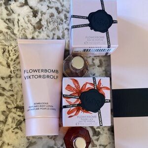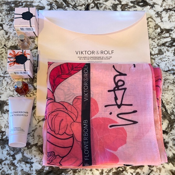 Chic pink floral accessory by Viktor & Rolf. Perfect for adding elegance. Enjoy a 1.7 fl oz perfume body lotion and two fragrances. These are all new.