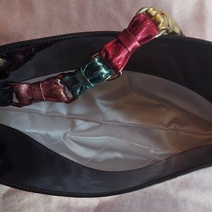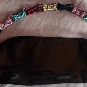 Adorable patent leather purse with a multicolor bow handle. Perfect for a party/theater