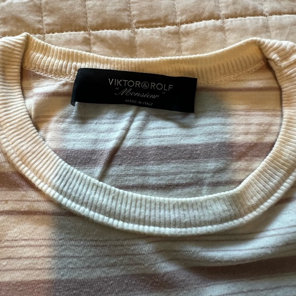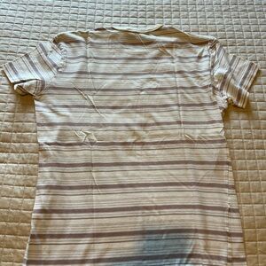 Light-colored shirt with stripes. There is discoloration on parts of the collar. Very light-weight.