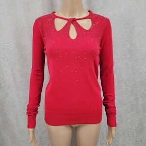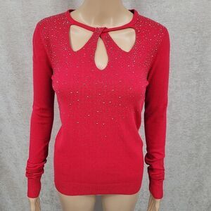 Stylish red sweater featuring keyhole design and sparkling rhinestones. Perfect for adding a touch of glamour to any outfit.