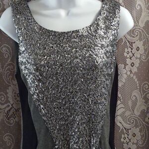 Vila size medium sleeveless pencil dress sequined front geometric gray black design cinches in waist, zip back, 16 inches pit to pit, excellent condition