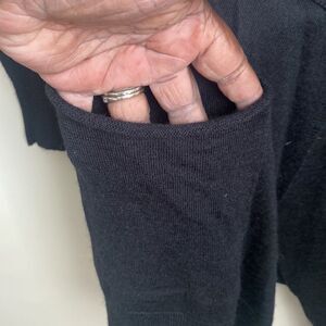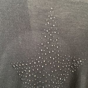 Black lightweight semi sheer long sleeve waterfall cardigan with star studded pattern on back, pockets, long line.