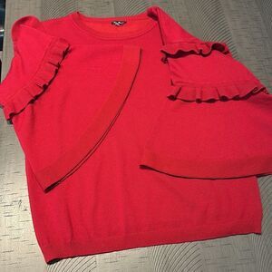 Pretty Vila Milano Red top with 3/4 length ruffled sleeves. Light cotton/poly/spandex blend. Gently used. Size Large.